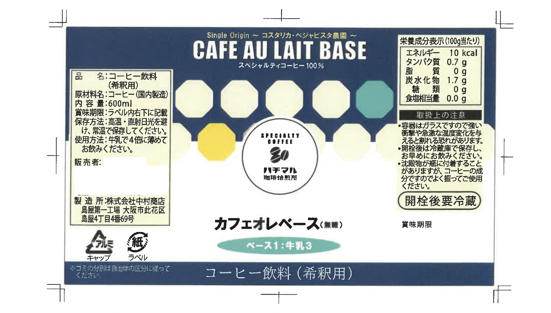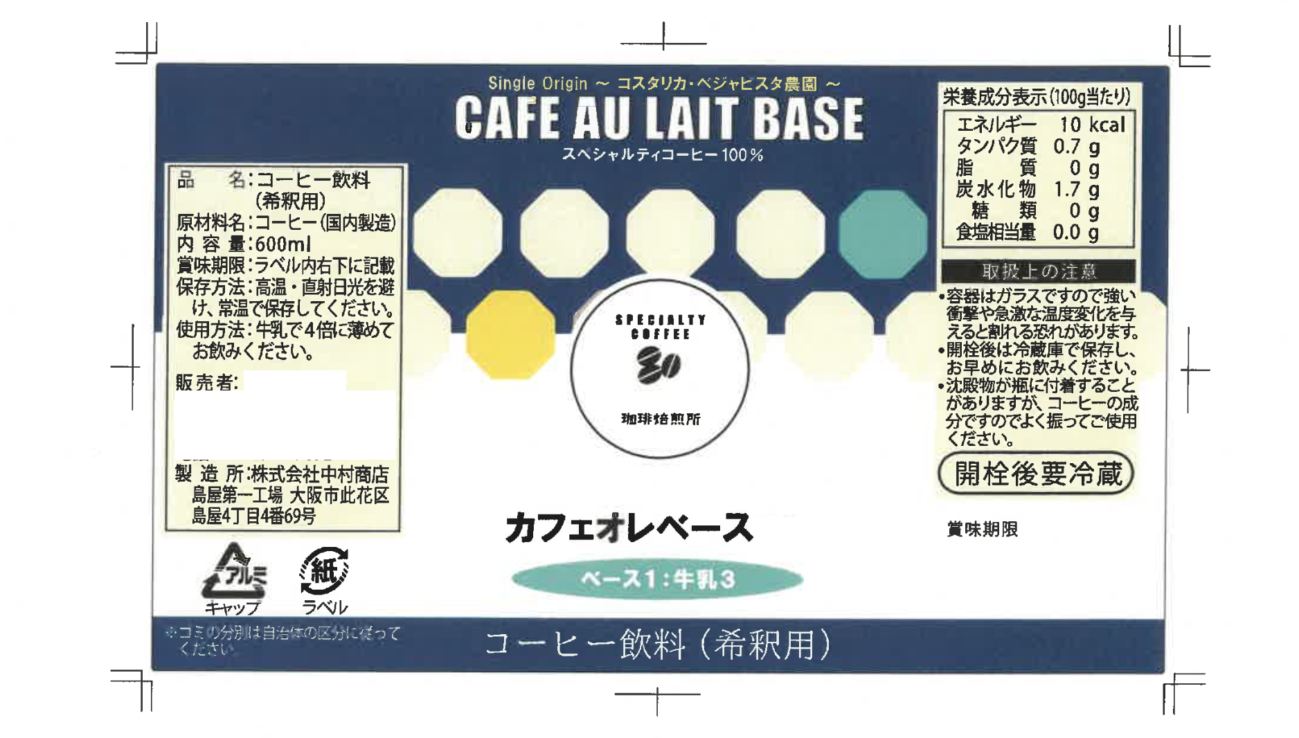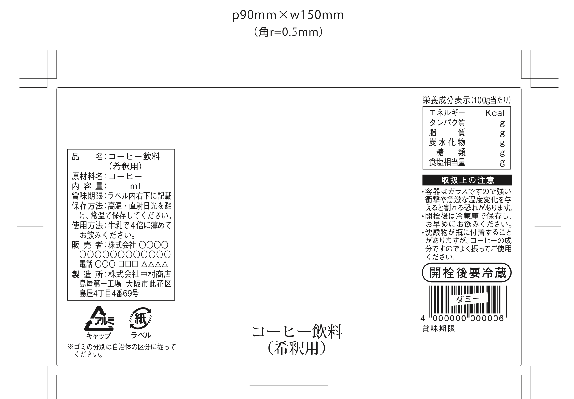 中央下(テンプレート参照):「コーヒー飲料(希釈用)」/カフェインレスの場合は「コーヒー飲料(カフェインレス)(希釈用)」